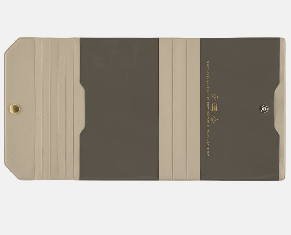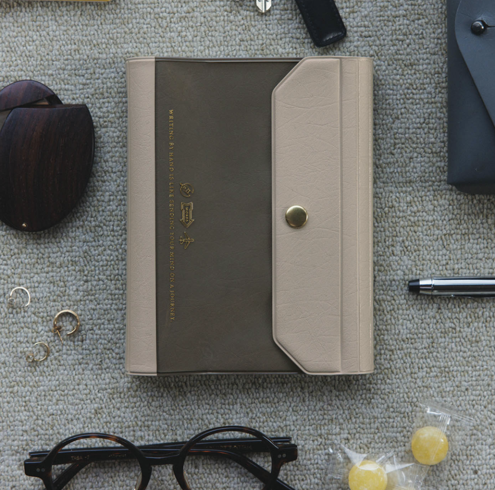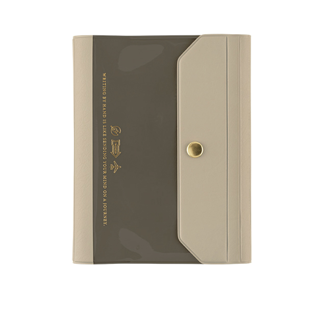 This slim PVC cover has a clear pocket as its main feature. The cover name “Alettone” refers to the part of an aircraft’s wings called an aileron, due to the way the techo cover’s lid can similarly fold shut with a snap. The soft PVC material makes it light and comfortable to carry, while the subdued color scheme gives it a sense of elegance. It closes with a snap button and has a design that fits any user in any setting. Foil-pressed in gold is the thought-provoking message, “Writing by hand is like sending your mind on a journey.”
