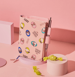 Made from glossy enamel material, the design is scattered with adorable dog and cat photos interspersed with English wording, all set against a soft pink background that enhances its playful, stylish vibe. The two pen holders that, when a pen is inserted, allow the cover to stay closed ensure both functionality and flair.