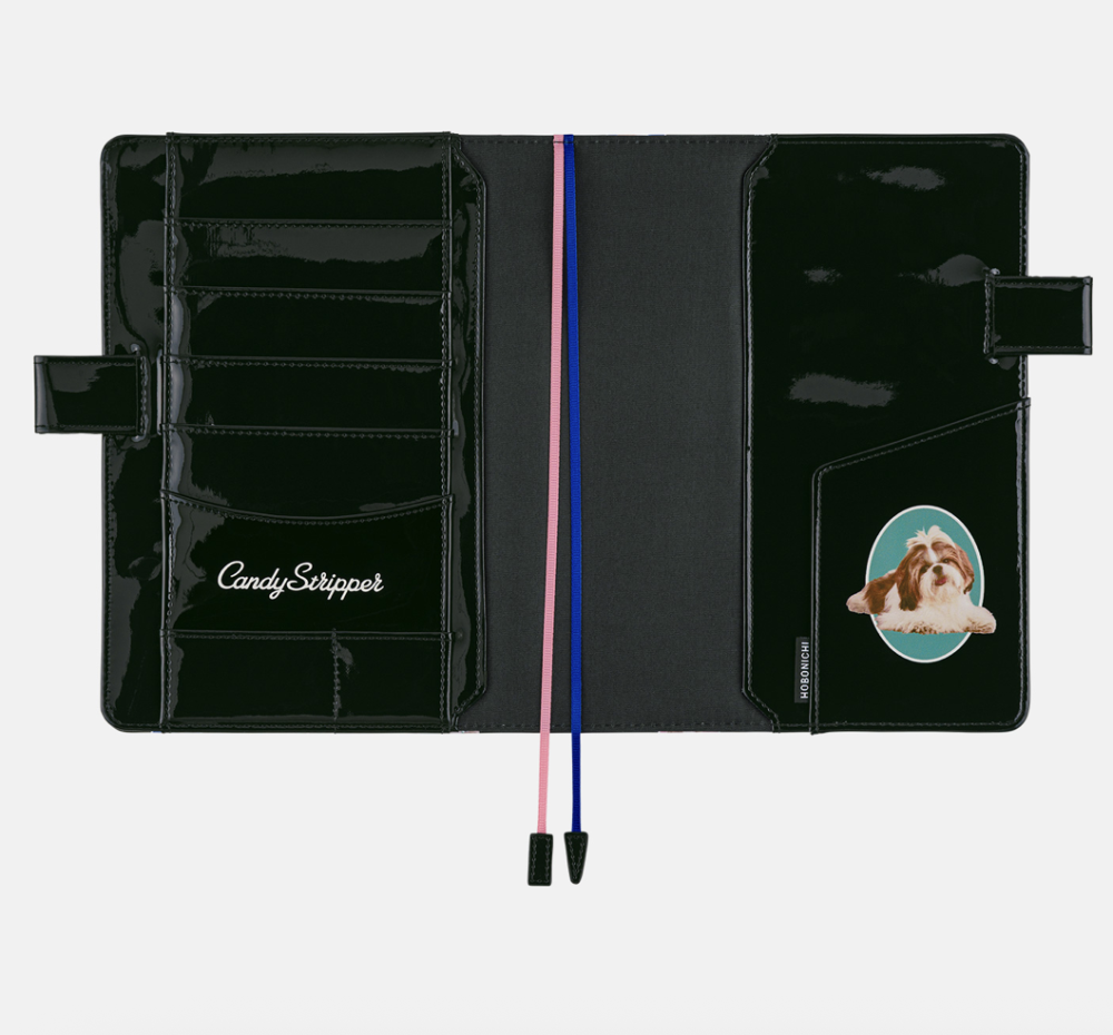 Hobonichi A5 Candy Stripper is a cover in glossy black enamel with playful dog and cat collage, pastel pink interior, logo detail, and colorful bookmarks. Retro-pop, stylish, and full of charm.