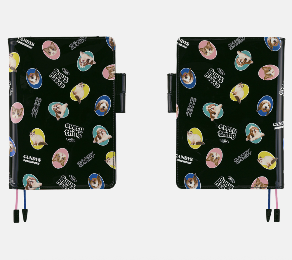 Made from glossy enamel material, the design is scattered with adorable dog and cat photos interspersed with English wording, all set against a black background that enhances its playful, stylish vibe. The two pen holders that, when a pen is inserted, allow the cover to stay closed ensure both functionality and flair.