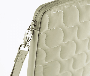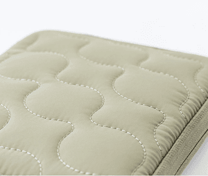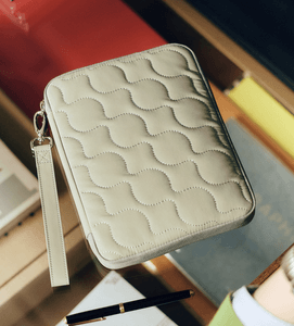 This pouch-style cover is made from pale sage green quilted fabric, offering both softness and durability. The cushioned base protects your items, so you can easily carry your techo, notepad, stationery, smartphone, or other essentials without worry. The cover features a secure zipper closure, and inside is a pen hook that holds a pen by its clip for quick access.