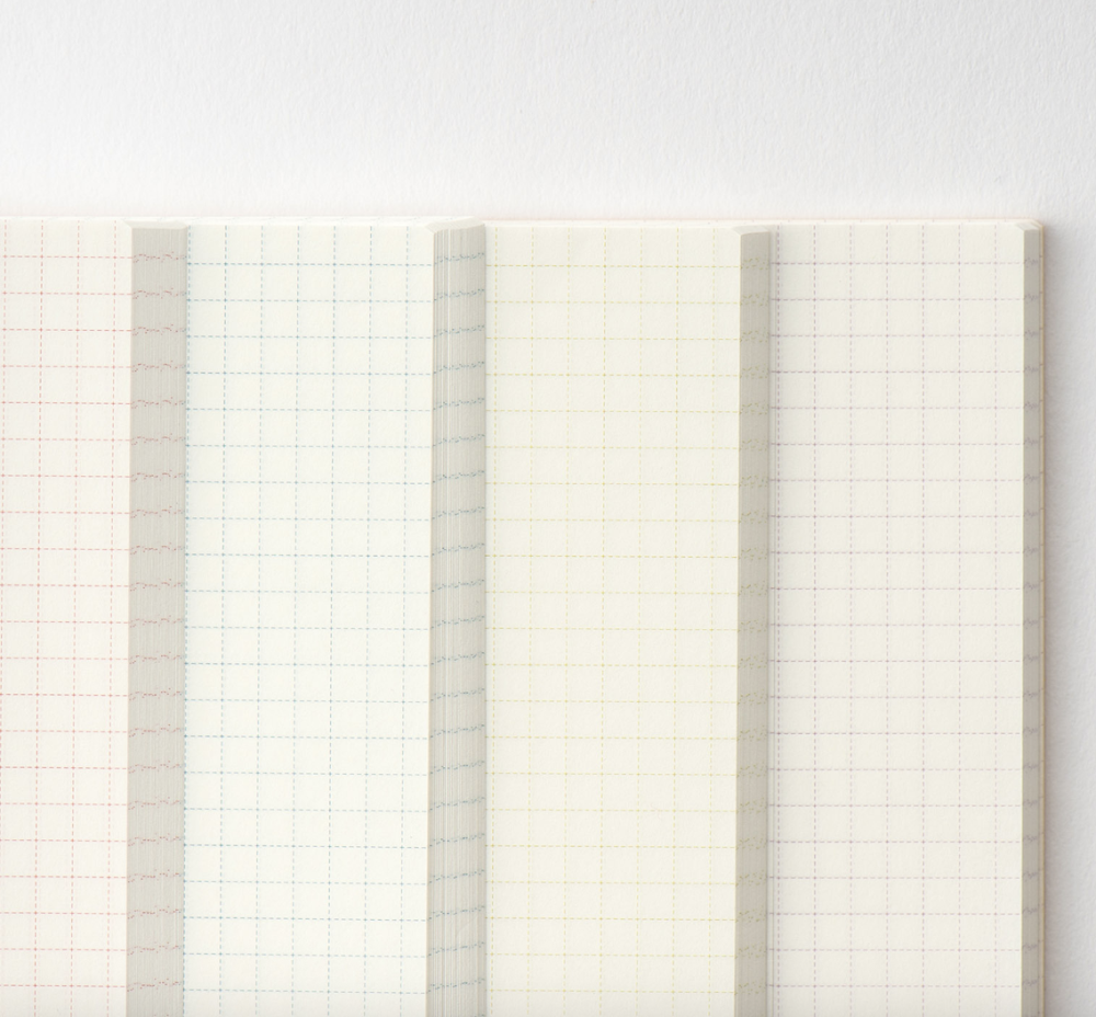 The 3.7 millimeter graph paper is the same as that of the Hobonichi Techo Original and Cousin. The color of the ink on the page changes (red / blue / green / purple) every 60 pages in the A6 size, and every 72 pages in the A5 size. This makes it easy to split the book into several themes or use the colors as a way to more easily find old entries.