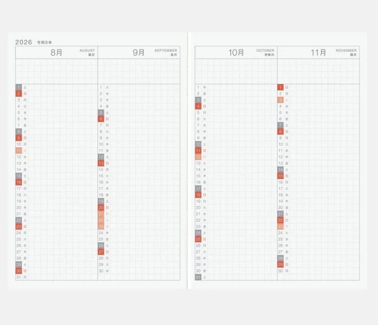 This is the two-part version of the Japanese-language A5 Techo Cousin. The Avec version includes two books—one covering January–June and the other covering July–December. This lets you carry a planner that is half the weight and thickness of the standard A5 Techo Cousin with just as much functionality. The Avec planners are compatible with the A5 Techo Cousin covers listed under Compatible Products, and both books contain the same extra pages in the back for filling out graphs and timetables that are found in the standard book, so you can seamlessly continue your records from one book to the next. Other features include: